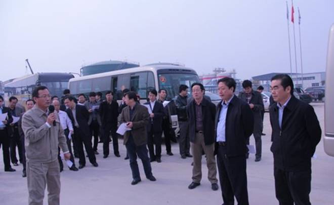 2013年10月31日,渤海新區黨工委書記丁繡峰一行蒞臨新啟元督導觀摩蒽油加氫項目建設,集團總經理于國臣等領導在綜合樓前進行接待。