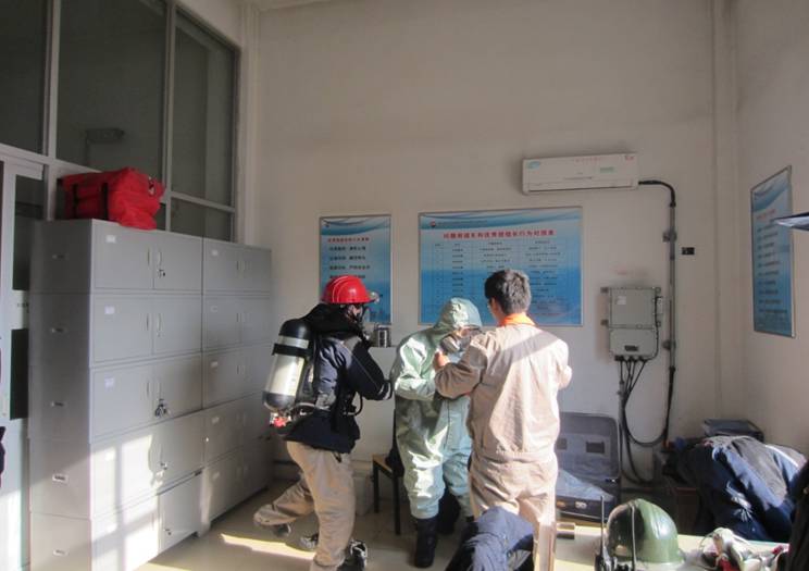 操作人員正在穿戴正壓式空氣呼吸器、防化服