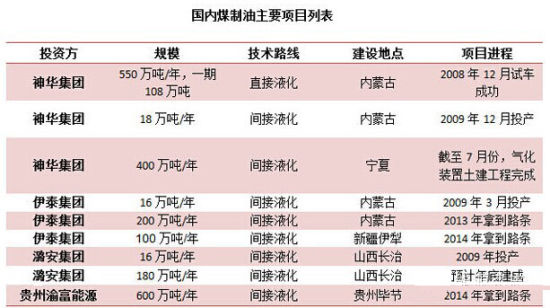 新型煤制油和煤制氣項目一覽