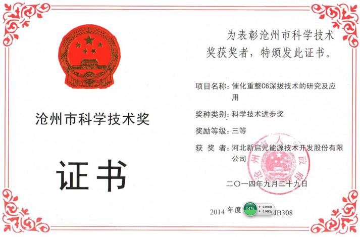 《催化重整C6深拔技術的研究及應用》項目是新啟元公司成立以來第一個獲得滄州市科學技術獎的項目,是公司科技研發力量的重大突破,代表公司的科技團隊實力受到滄州市科技局和石油化工行業內專家的認可,是公司科技進步的象征。