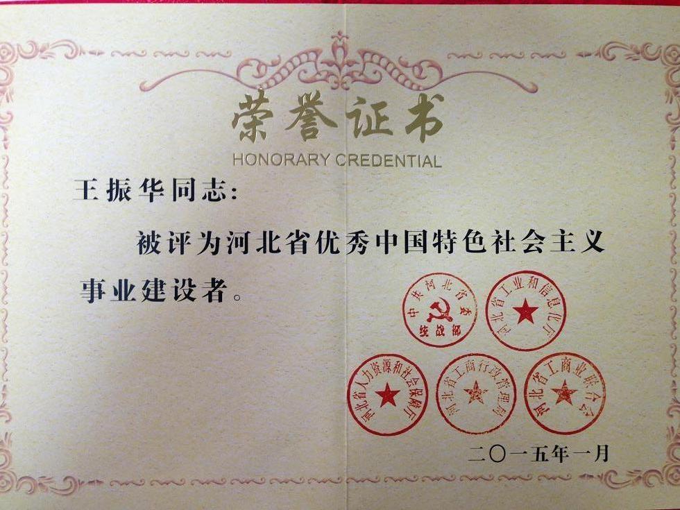 1月4日,第五屆河北省優秀中國特色社會主義事業建設者表彰大會在石家莊召開,包括集團公司董事長王振華同志在內的48名非公有制經濟人士和其他社會階層人士獲得了“優秀中國特色社會主義事業建設者”榮譽稱號。