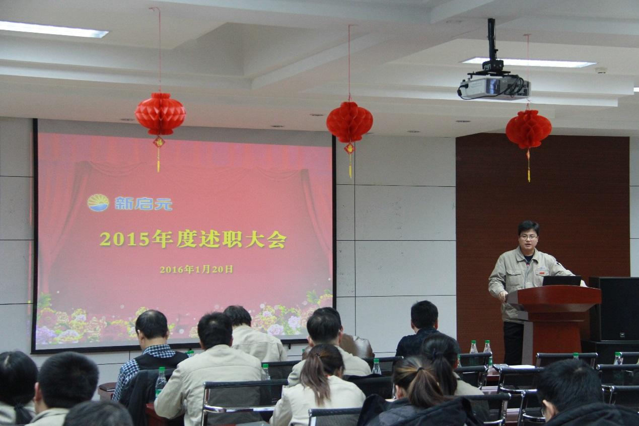 1月20日上午9:30,新啟元公司在科研樓六樓會議室隆重召開2015年度中層管理干部述職大會,新啟元公司總經理喬樹華,副總經理劉立新、劉華冰,總工程師鄭擁軍,財務總監崔金華及來自各部門的49名基層員工代表,對13名中層管理干部的年度工作表現進行了評分。會議由副總經理劉華冰主持。