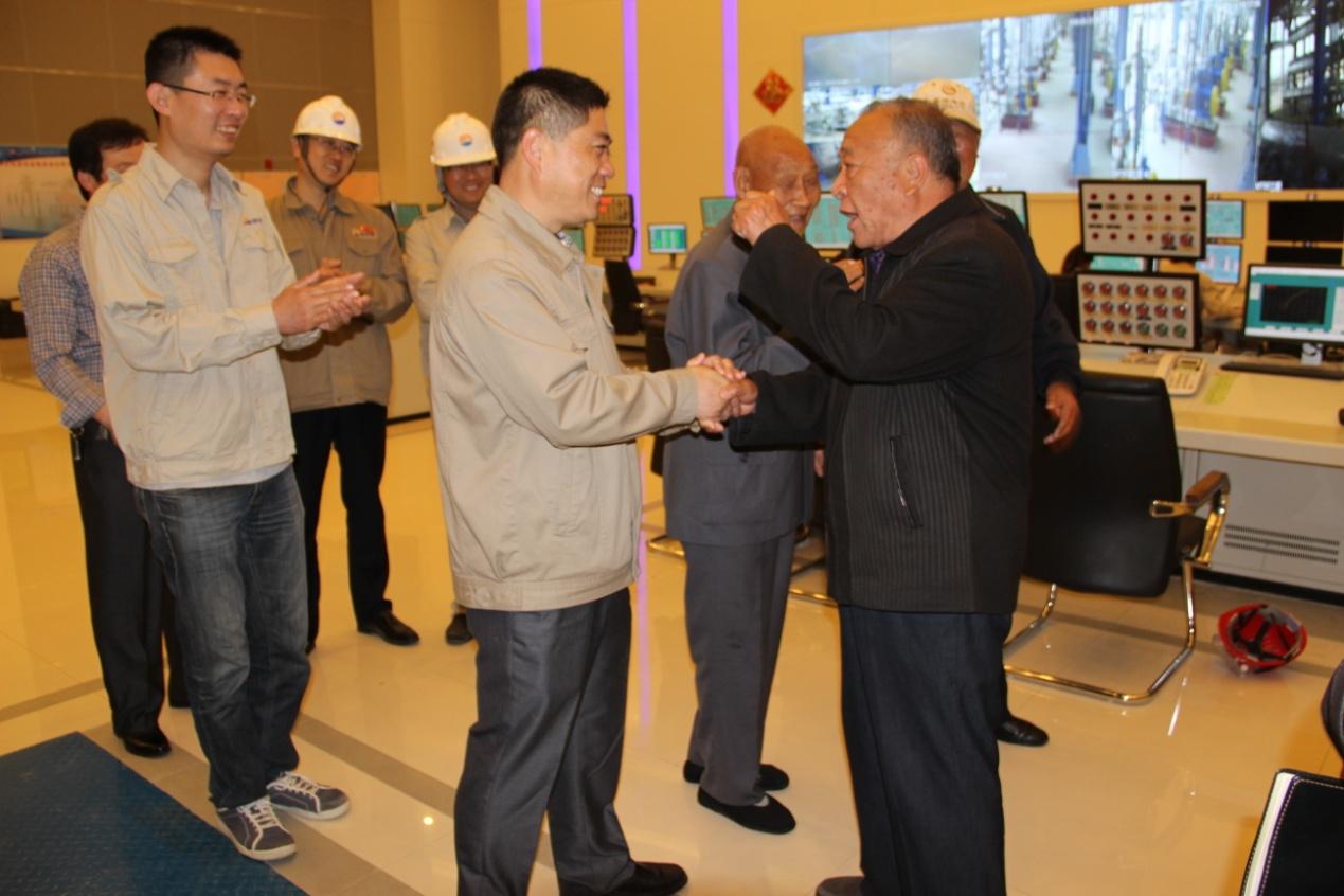 老干部們兩鬢斑白但步履矯健,在喬總的陪同下沿經五路參觀了新欣園碳四精細化工一體化項目、熱電項目以及中控室。喬總沿途向老干部門介紹了公司的發展前景、采用的先進技術以及裝置投產后的效益情況。