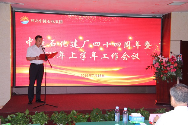 7月16日上午9:30,河北中捷石化集團在華悅凱旋大酒店4樓宴廳隆重召開建廠44周年暨2019年上半年工作會議,集團公司董事長王振華、總經理喬樹華等集團領導及各級管理人員共計74人參加會議,整個大廳座無虛席。大會由集團公司黨委書記于國臣同志主持。
