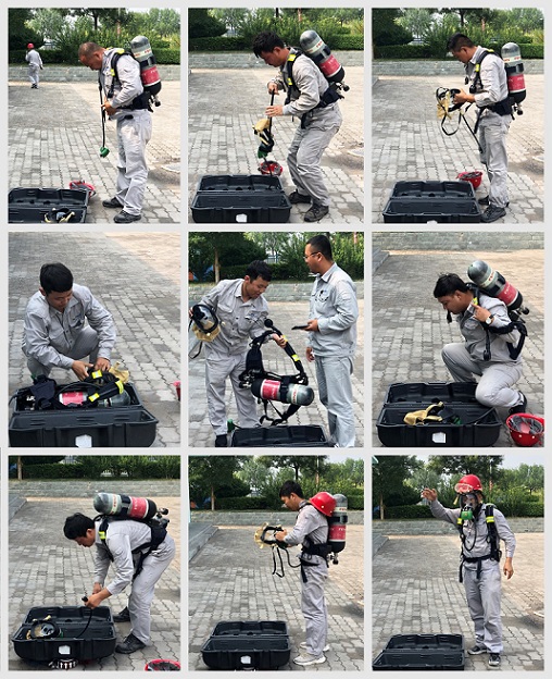 第四周為“應急器材技能比武”活動周。此次比武的內容是“空氣呼吸器穿戴”。該項目重點檢驗員工對空氣佩戴裝置、氣瓶壓力、報警閥、面罩以及呼吸閥的檢查,對呼吸器佩戴操作的熟練性和連貫性等。參賽選手緊抓比賽要點,梳理檢查、佩戴、調整、確認四個操作環節。比賽期間,參賽選手們不時對佩戴技巧和要點難點進行交流,共同探討如何提升技能。