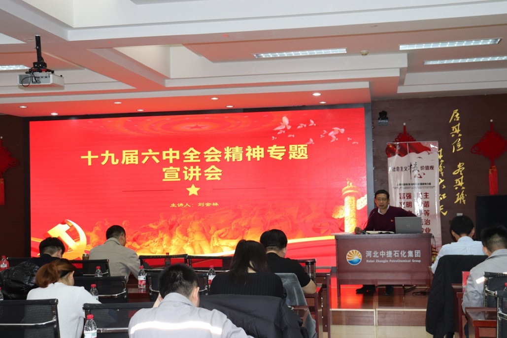 集團公司訊 12月10日上午,河北中捷石化集團黨委在科研樓六樓會議室組織舉辦了黨的十九屆六中全會精神專題宣講會,集團黨委書記于國臣,黨委副書記、紀委書記朱振江等集團領導,各黨(總)支部書記、黨員代表共計40余人參加。宣講會特邀中捷產業園區宣傳部副部長劉金林主講。