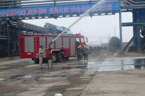 演練選在甲醇裝置廣場處進行。在模擬事故現場,參加人員分成多個應急小組,人員救援組進行人員救助,事故搶險組進行滅火,環境監測組進行環境監測,應急疏散組進行人員撤離并指揮消防車進入事故現場,各個環節緊張有序的進行。滅火完畢后指揮人員發布命令,宣布結束應急狀態。