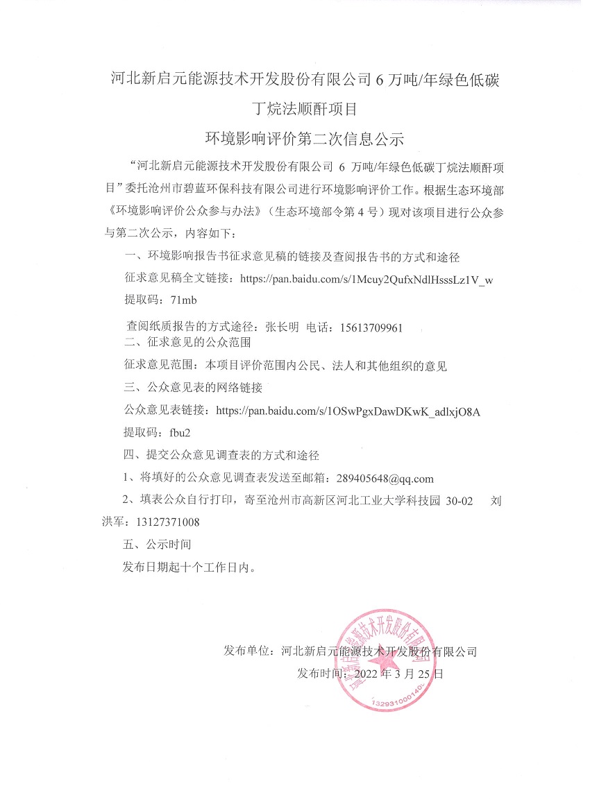 河北新啟元能源技術開發股份有限公司6萬噸/年綠色低碳丁烷法順酐項目環境影響評價第二次信息公示