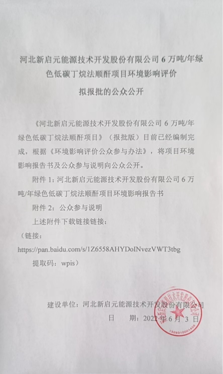 河北新啟元能源技術開發股份有限公司6萬噸/年綠色低碳丁烷法順酐項目環境影響評價擬報批的公眾公開